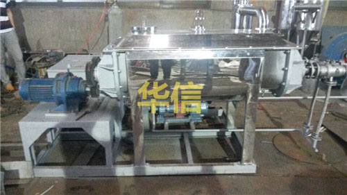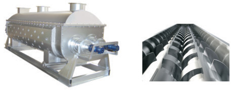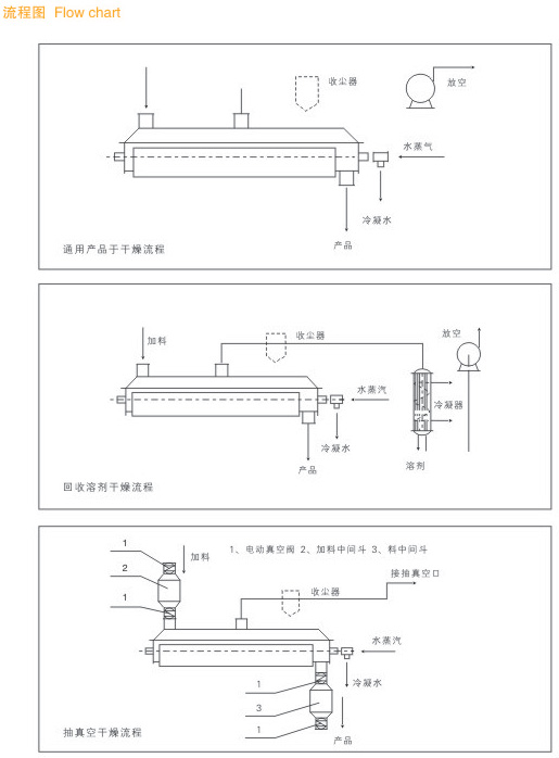 概述: 空心轴上密集排列着楔型中空桨叶,热介质经空心轴流经桨叶。单位有效容积内传热面积很大,热介质温度从-40℃到320℃,可以是水蒸汽,也可以是液体型:如热水、导热油等。间接传导加热,没有携带空气带走热量,热量均用来加热物料。热量损失仅为通过器体保温层向环境的散热。楔型 桨叶传热面具有自清洁功能。物料颗粒与楔型面的相对运动产生洗刷作用,能够洗刷掉楔型面上附着物料,使运转中一直保持着清洁的传热面。桨叶干燥机的壳体为W型,壳体内一般安排二到四根空心搅拌轴。壳体有密封端盖与上盖,防止物料粉尘外泄及收集物料溶剂蒸汽。出料口处设置一挡扳,料位高度,使传热面被物料覆盖而充分发挥作用。热介质通过旋转接头,流经壳体夹套及空心搅拌轴,空心搅拌轴依据热介质的类型而具有不同的内部结构,以的传热效果。